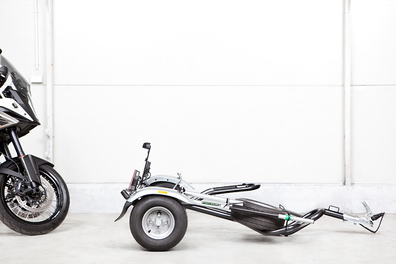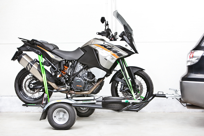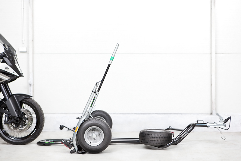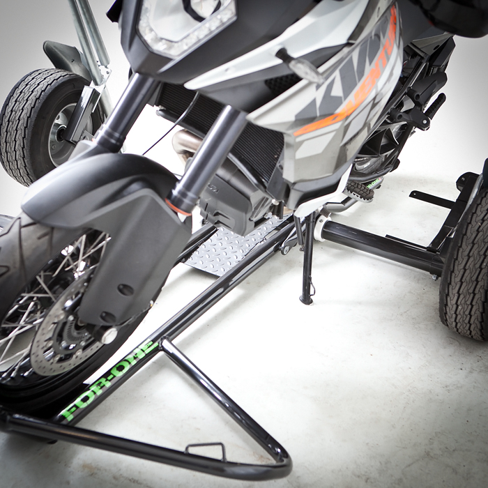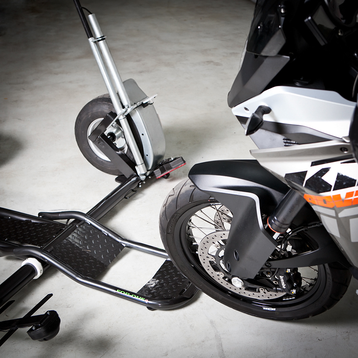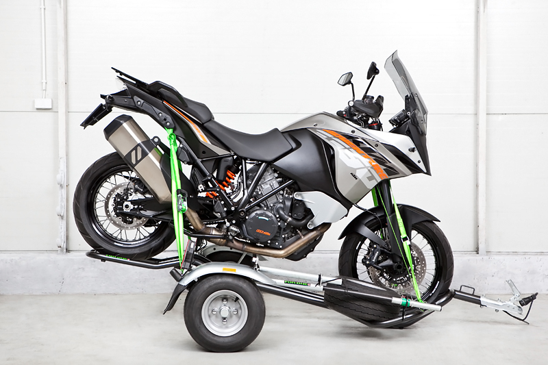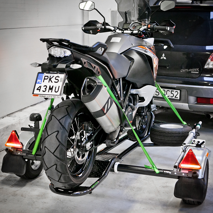 3. Przypnij motocykl pasami z przodu następnie przy pomocy dźwigni unieś przyczepę i zapnij dźwignię w haku. Jeśli motocykl jest zbyt ciężki możesz użyć przedłużenia dźwigni